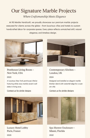 Step into the world of elegance with our most iconic marble installations — where timeless craftsmanship meets modern luxury. Each project showcases the art, precision, and beauty of RS Marble Handicraft’s legacy.