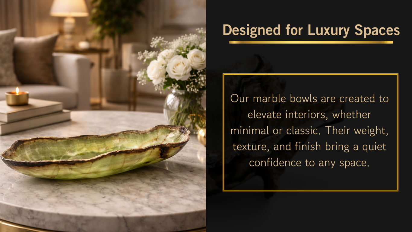 Experience the artistry of curved marble bowls, crafted with precision and luxury in mind. Ideal for serving, decor, and gifting — each bowl reflects timeless elegance. Made from premium natural stones like White Marble, Black Zebra, and Green Onyx. Available for international bulk export.
