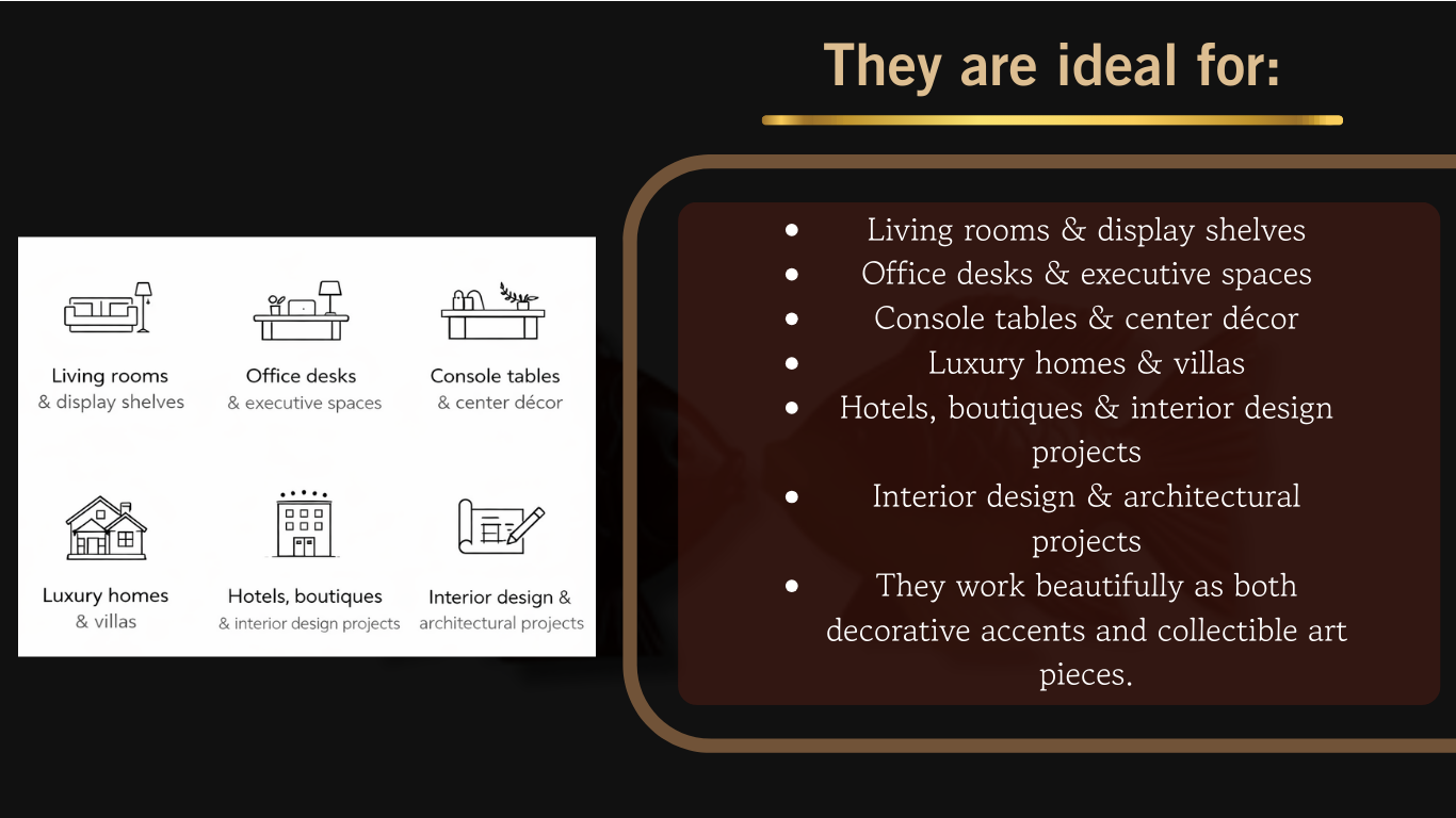 Every piece reflects the beauty of natural veins and color movement, making each sculpture truly unique.