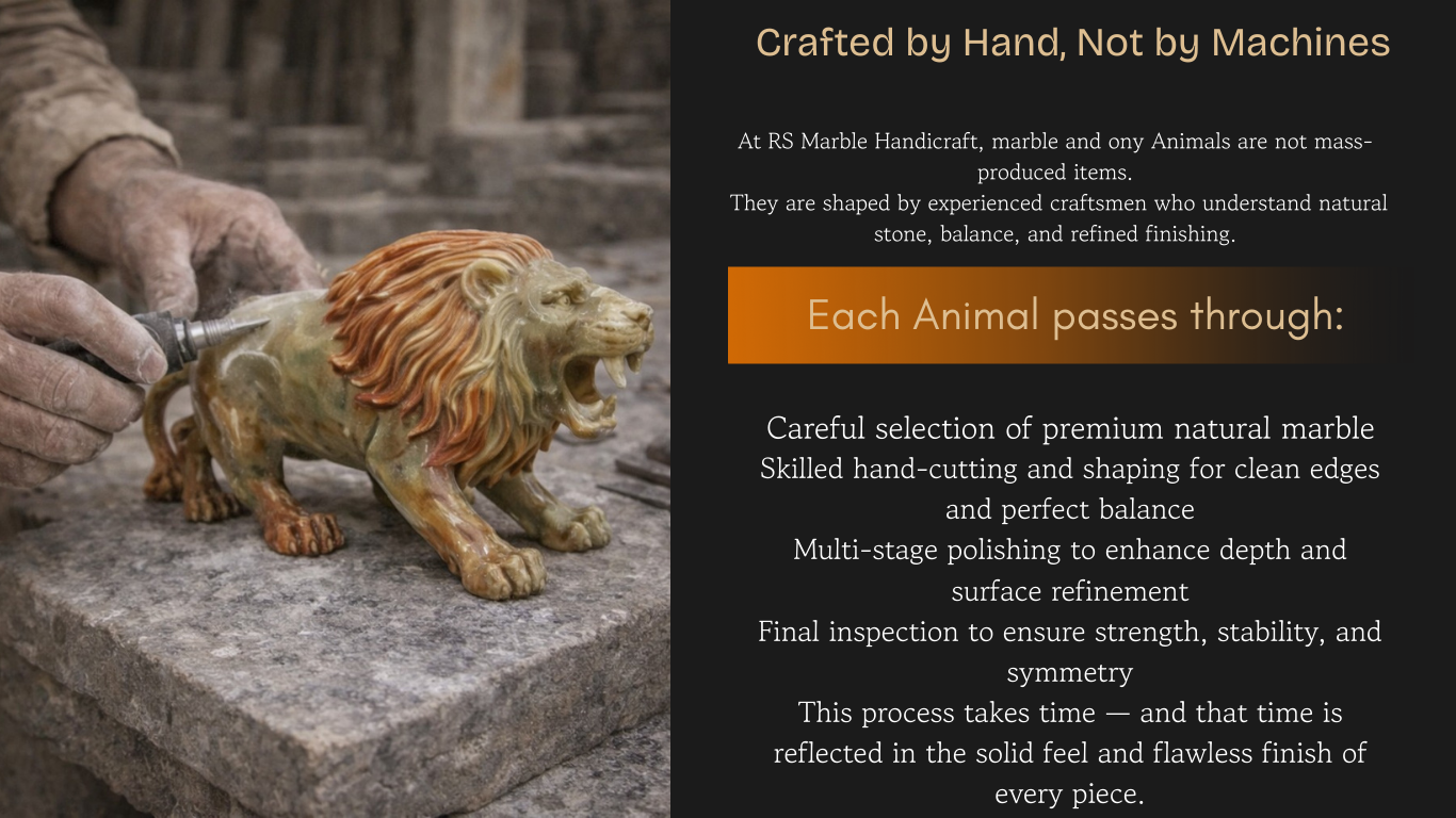 Marble and onyx animal sculptures are more than decorative objects — they are artistic expressions carved from nature itself. At RS Marble Handicraft, each animal figure is handcrafted from premium natural marble and onyx, shaped to capture strength, grace, and character in solid stone.