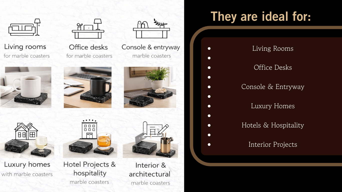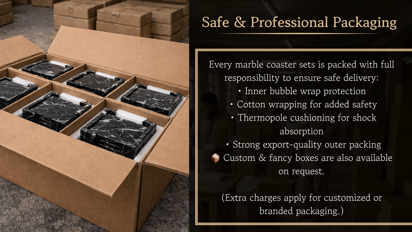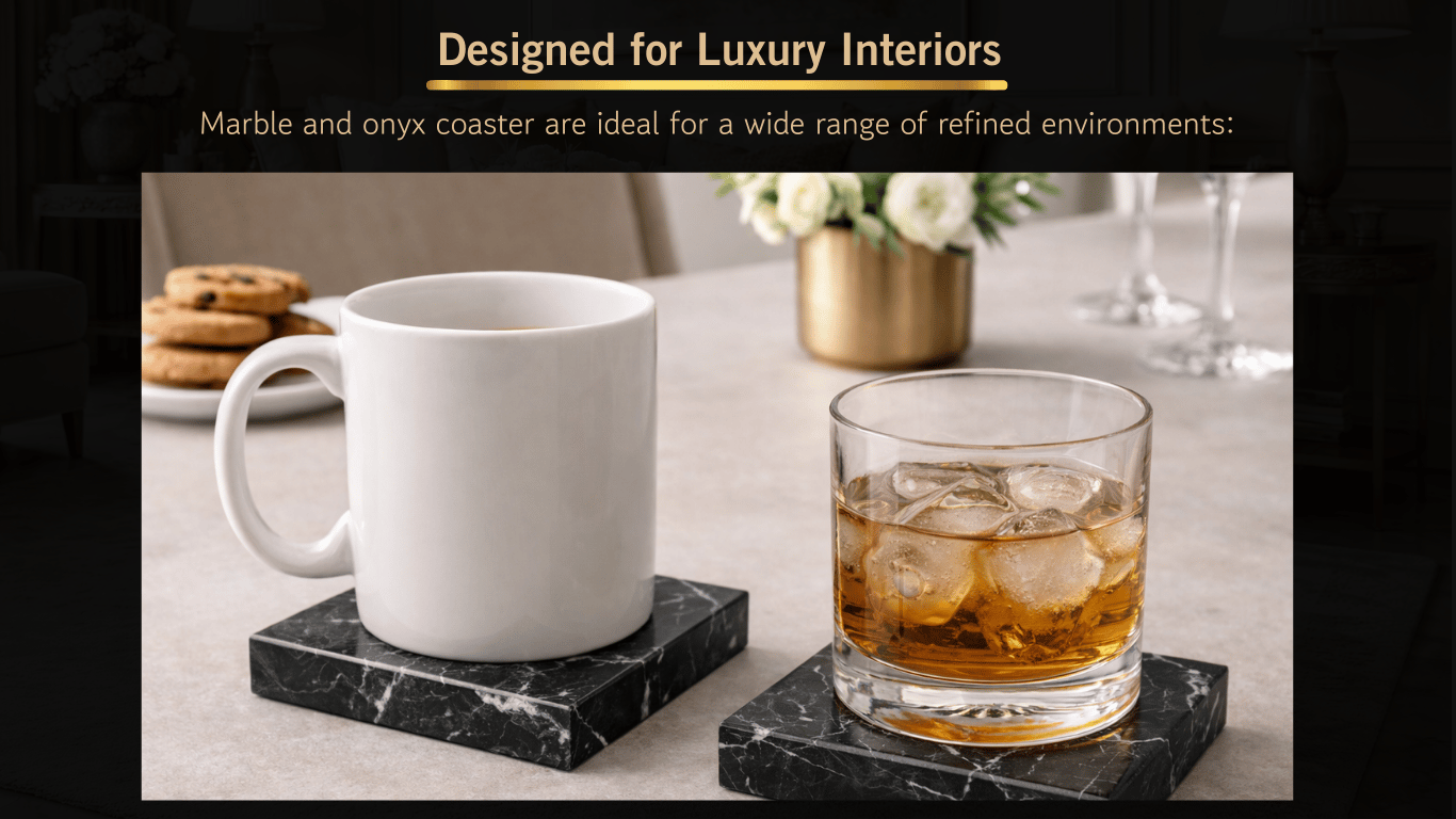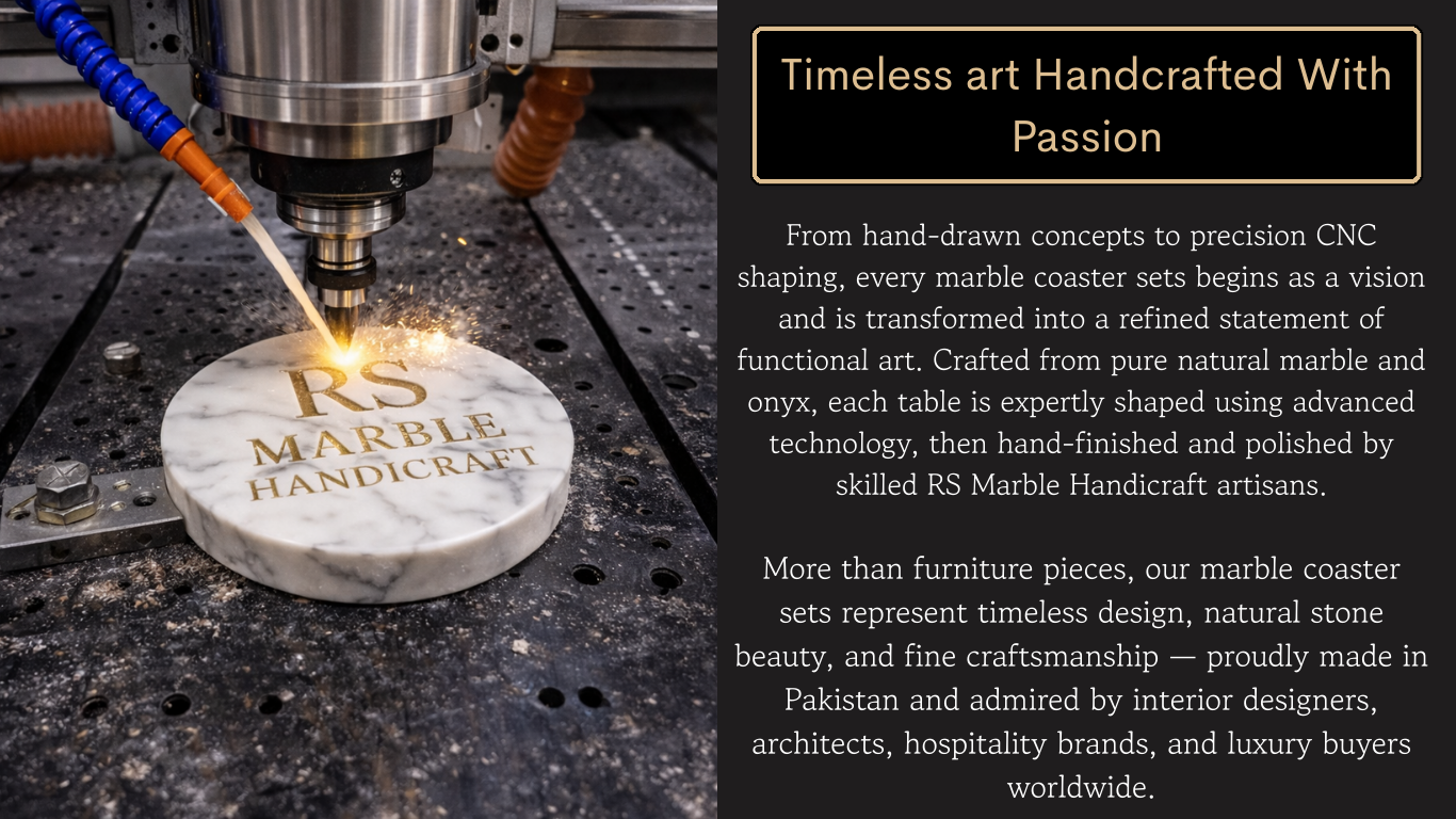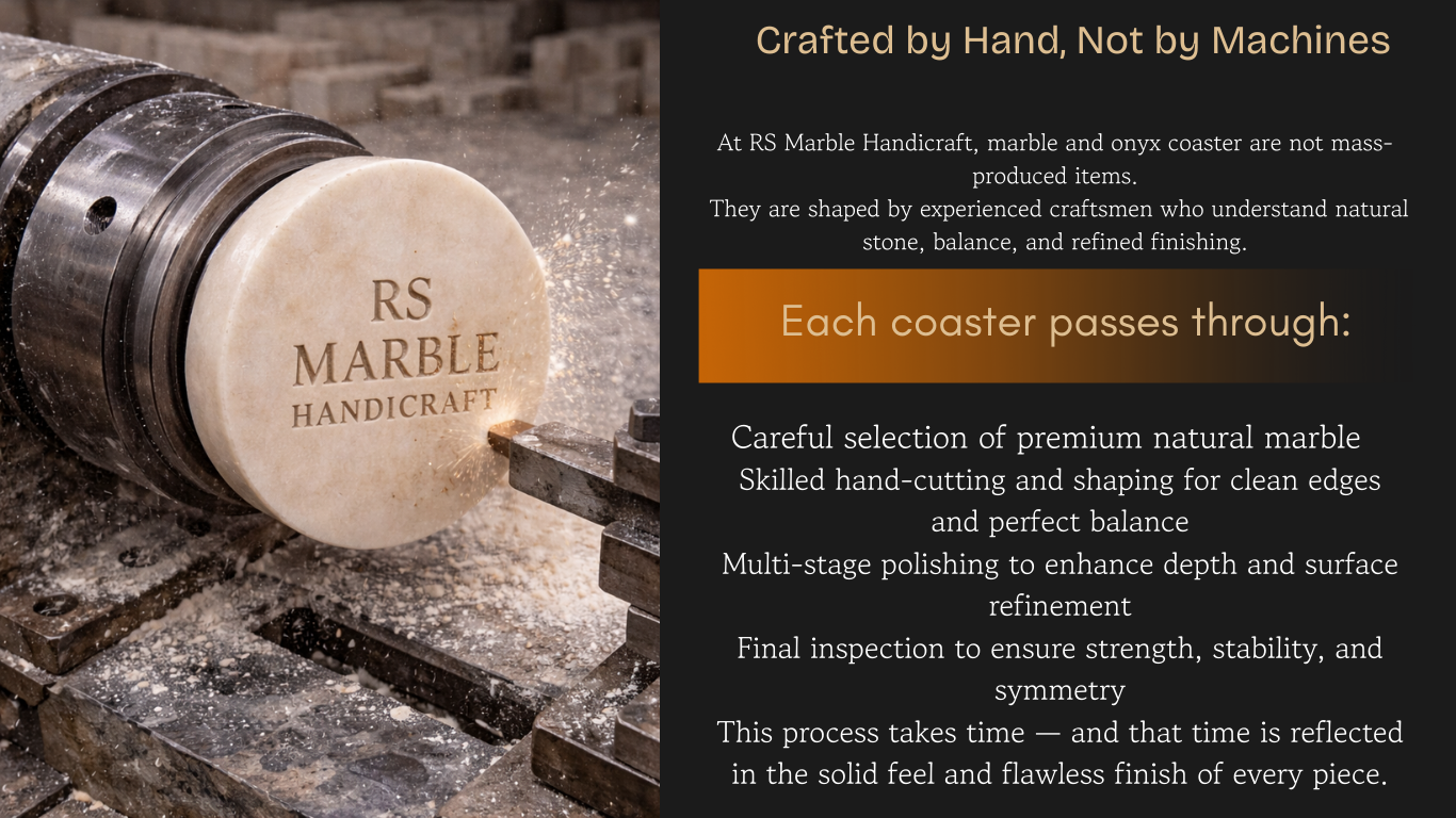 Elevate your table settings with our handcrafted marble coasters, designed for durability and luxury. Each coaster is crafted from high-quality stones like white marble, black marble, green onyx, pink onyx, zebra stone, and more. Ideal for protecting surfaces from heat and moisture while adding a decorative touch. Perfect for luxury hotels, restaurants, cafes, and home décor collections.