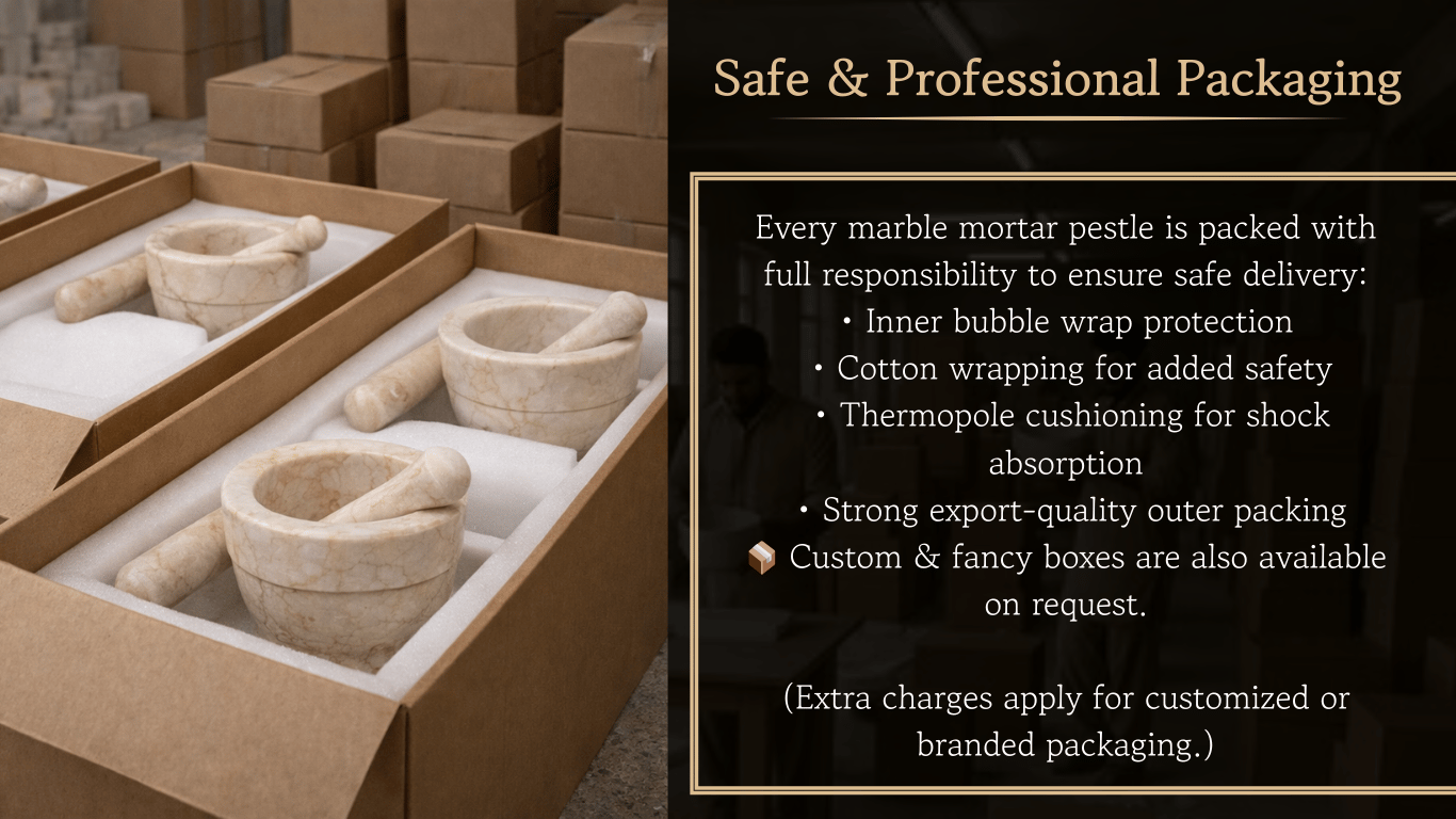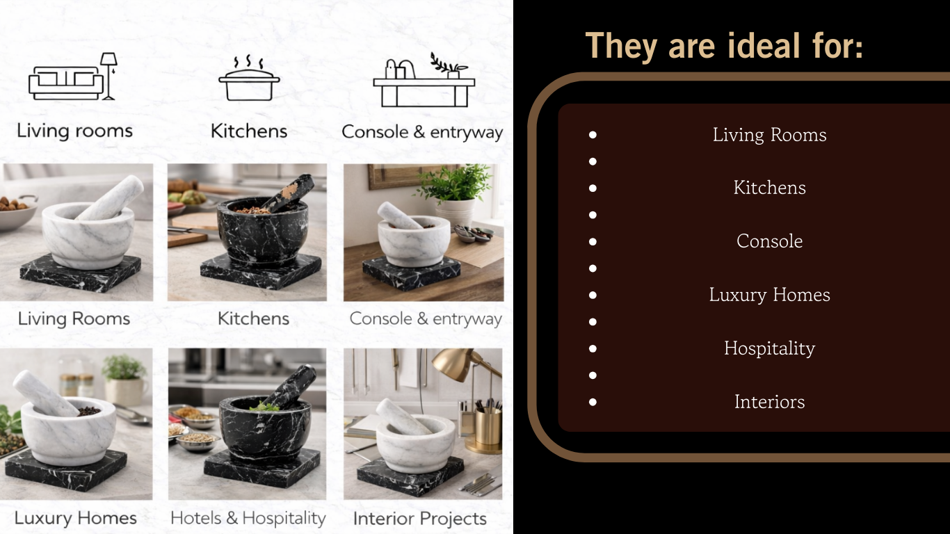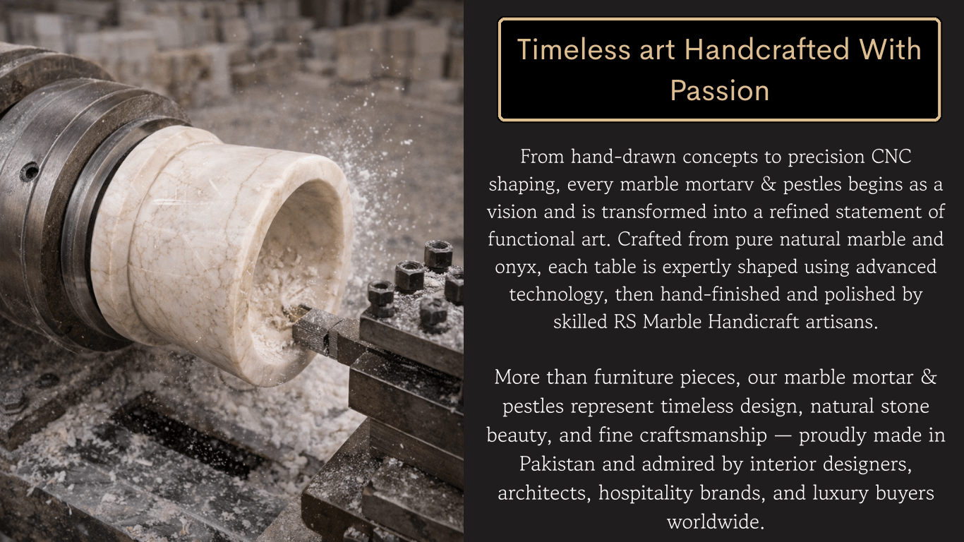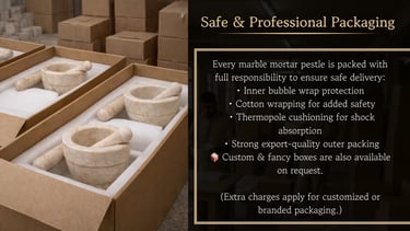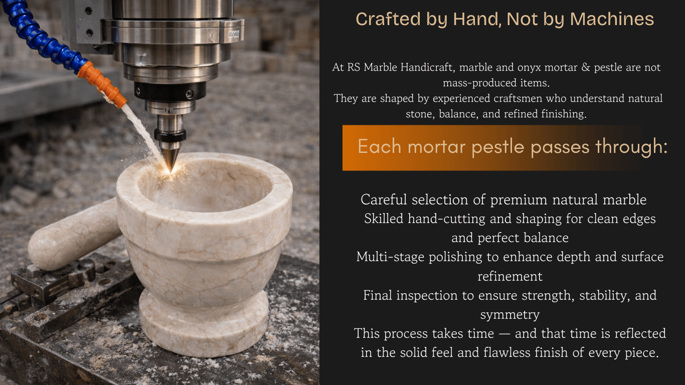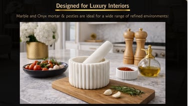 Experience traditional craftsmanship with our marble mortar and pestle sets, ideal for grinding spices, herbs, and seeds with ease and style. Carved from natural stones like white marble, green onyx, and black marble, each set is durable, food-safe, and aesthetically elegant. A perfect addition for modern kitchens, restaurants, and spice retailers. We offer bulk B2B supply and export globally from RS Marble Handicraft.